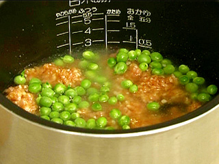 鶏肉は浸水した米の上にちぎってのせるだけでOK。全体を混ぜたりしないで!