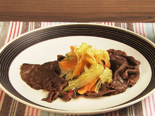 牛肉を焼いたフライパンで野菜を炒めるので(肉汁を活かす)、 焼いた肉は冷めないように保温しておくこと。