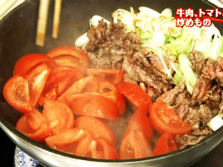 長ねぎ、牛肉を順にそれぞれ炒めたら、トマトを入れるスペースを作って!! トマトは焼きつけるように、イチイチさわらないで!