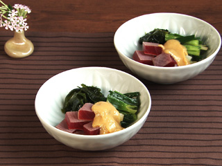 まぐろは脂身の少ないものを求め、さっと湯にくぐらせて水にとって冷まします(長く水につけると水っぽくなる)。