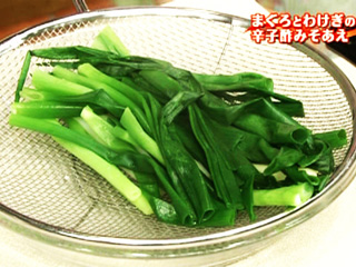 ゆでたわけぎはザルに上げ、葉先を根元の部分の上にかぶぜて蒸らす。