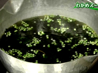 材料: わかめ(塩蔵)・・・30g(洗ってもどす) 万能ねぎ(根元の部分)・・・1/2わ分 水・・・4カップ 煮干し・・・15g 酒・・・大さじ2 しょうゆ・・・大さじ1 塩・・・小さじ1/2 こしょう・・・少々 ごま油・・・少々 作り方 (1)鍋に水、頭と腹ワタを除いて裂いた煮干しを入れて火にかけ、10分ほど煮出しておく。 (2)(1)にもどしたわかめと万能ねぎの小口切りを加え、調味料とごま油を加えてひと煮する。