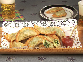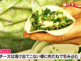 皮の上に肉だねを広げ、真ん中にチーズをおく。揚げたときに溶けださないように芯にして!