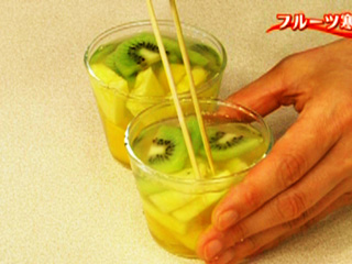 パイナップルやキーウィはたんぱく質分解酵素があるので、ゼラチンだと固まらないので、寒天でよせましょう。