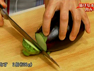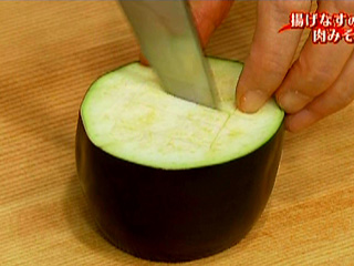 米なすがない場合は、普通のなすを縦半分に切って皮目に切り込みを入れながら2~3等分に切って使います。