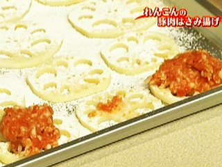 (2)小麦粉をふってから肉だねをのせる(1枚おきに)。