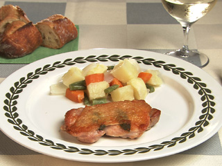 つけ合わせの野菜のバター煮は、野菜の甘みがよく出ているので、季節に応じた野菜で作るとよいでしょう。