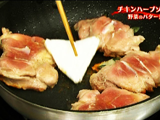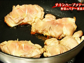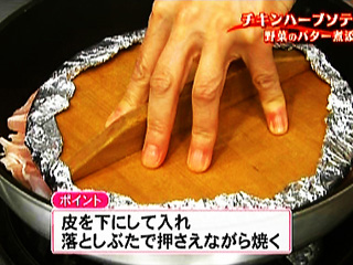 (1)鶏肉は皮面から、落し蓋などで押さえながら焼く。