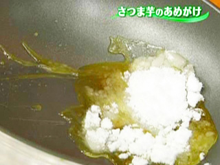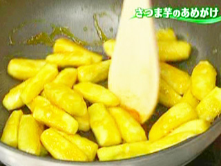 (4)火を止めて、さつま芋を投入し、手早く混ぜる。