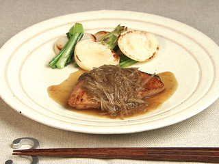 ごぼうソースのごぼうが柔らかくなるまで煮てからとろみをつけ、しょうががアクセントです。