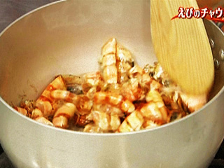 えびのからは炒めて香ばしくなったところに、湯を加えて煮る!!