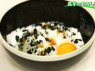材料: 長芋・・・200g 大根おろし・・・1カップ 卵黄・・・1個分 焼きのり・・・適量 炒り白ごま・・・適量 ・しょうゆ 作り方 (1)長芋は皮をむいて、ポリ袋に入れて麺棒で軽く叩く。 (2)(1)を器に入れ、水気をきった大根おろしを加えてあえ、卵黄1個落とし、白ごま、ちぎったのりをちらし、しょうゆ少々をおとす。