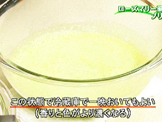 このローズマリーを入れた状態で一晩おいてから作るとさらにローズマリーの香りがさらに深く、グリーンもより鮮やかに出ます。