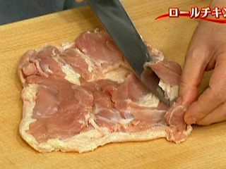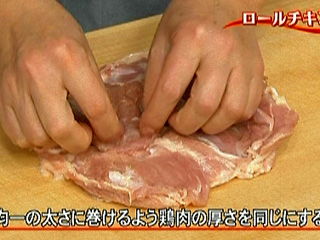鶏肉はムラが出ないように厚みを均一にしておくこと。