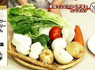 じゃが芋、にんじん、玉ねぎ、トマト、かぶ、かぶの葉、白菜、大根、カリフラワー、ブロッコリー、れんこん、ごぼうなど