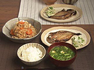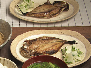 あじの干ものは、熱したグリルでこんがりと焼く。
