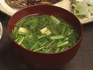 豆腐はさいの目に切り、せりは2cm長さに切る。鍋にだし汁と豆腐を入れて火にかけ、煮立ったらみそを溶き入れ、煮立つ直前にせりを加えて火を止める。