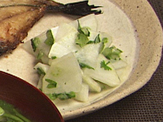 大根はいちょう切りにし、大根の葉少々は小口切りにする。塩(大根400gに小さじ1の割合)をふってもみ、しんなりしたら水気を絞る。
