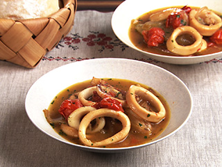 だし汁やスープの素を使わずに水で煮て、いか、玉ねぎ、トマトの素材のうま味を引き出します。