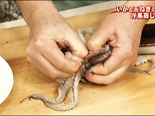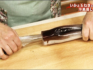 (1)胴からワタと足をはずす。(軟骨を抜く)