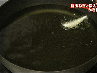 (1)温度をみる。玉ねぎを少量入れてみて、シュワーっと泡立ってくればOK。