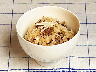 もう一品の炊き込みごはんの牛肉はさっとゆでてアクや臭みを除き、熱いうちに下味をつけること。
