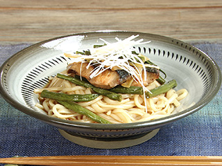この料理、滋賀県長浜の郷土料理「焼きさばそうめん」をうどんでアレンジ。