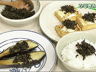 焼きなすにのせて。なすを油をひいたフライパンで両面焼き、ひじきみそをのせて炒り白ごまをふる。
