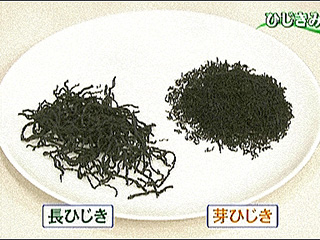 波の荒い岩礁地帯で多く採れる海藻の一種。一般的には加熱してから乾燥させたもので、「生ひじき」として出回るものも乾燥品をもどしたもの。芽ひじきのほかに、主軸の部分を長い形で乾燥させた「長ひじき」もある。もどすと10倍くらいに増える。 もどし方 ボウルに入れてたっぷりの水を加え、20~30分つけてもどしてから(爪でスッと切れるくらいが目安)、ザルに上げて砂を落とすようによく洗う。