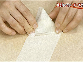 (5)途中、角にのりをつけてキュっとおさえる。(こうしておくと、中に油が入らない)