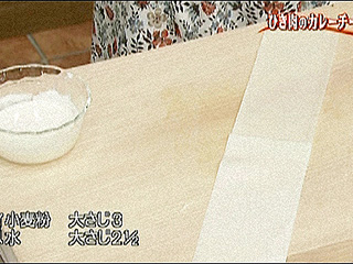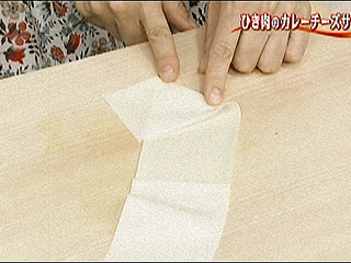 (1)春巻きの皮を三等分に切ったものを2枚たてにつなぐ。