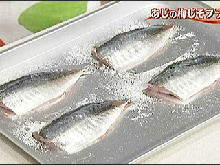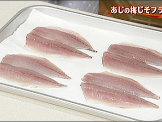 (1)三枚おろしにしたあじを背中合わせになるように並べる(皮目は下にして)。