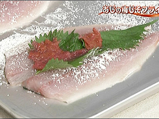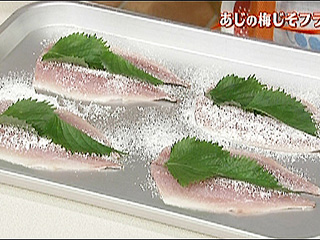 (2)青じそを1枚と半分をのせる(尾に近い方に半分をおく)。