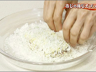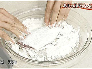 (5)衣は2度づけ、小麦粉と卵は合わせ目のところにもしっかりまぶす。