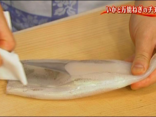 (3)エンペラをはずしたところを手がかりに、皮をむく(ペーパーを使うとよい)。