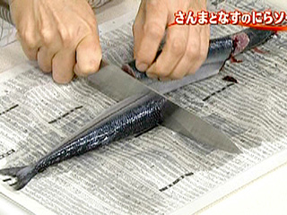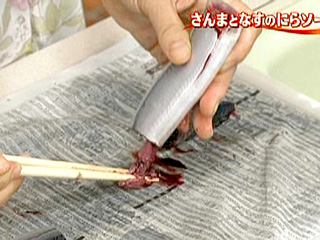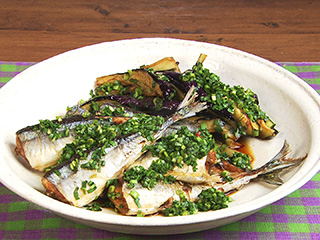 なすを揚げた後、一度火を止めて温度を下げてからさんまを揚げます。