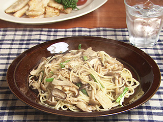 きのこは種類をいろいろとり合わせて使います。 それぞれ食べやすい大きさに切るか、細かくほぐしておく。
