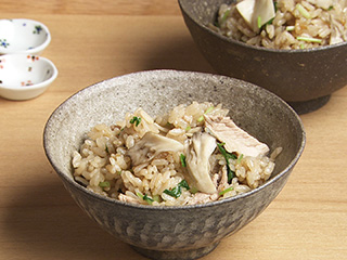 舞茸と豚肉を煮た香りのよい煮汁でごはんを炊き、炊きあがりに具を混ぜる方法です。