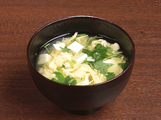 材料: 絹ごし豆腐・・・1/3丁 卵・・・1個 三つ葉・・・1/2わ だし汁・・・4カップ 塩・・・小さじ2/3 しょうゆ・・・小さじ1 片栗粉・・・小さじ1(同量の水で溶く) 作り方 (1)豆腐はさいの目切り、三つ葉は1cm長さに切っておく。 (2)鍋にだし汁を入れて煮立て、塩、しょうゆで調味し、水で溶いた片栗粉を加えてとろみをつけ、豆腐を加え、卵を溶いて流し入れ、ふわっと卵に火が通ったら、三つ葉を加える。