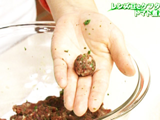 ケフタが豆となじむように、小さく丸めるのがポイント。