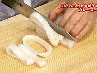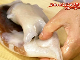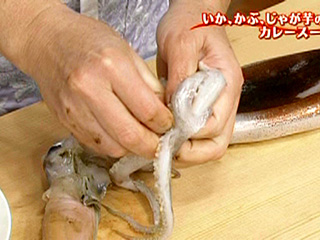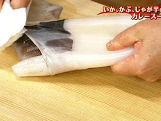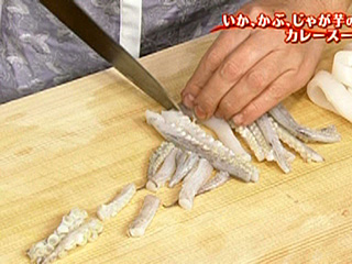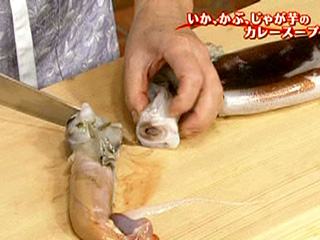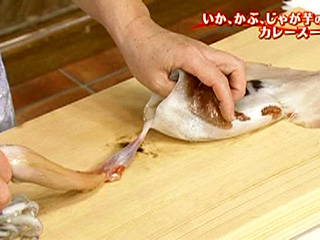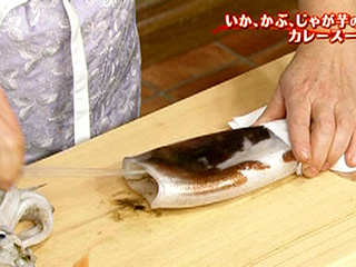 (8)エンペラも皮をむき、足は1本ずつ切り離し、5~6cm長さに切る。