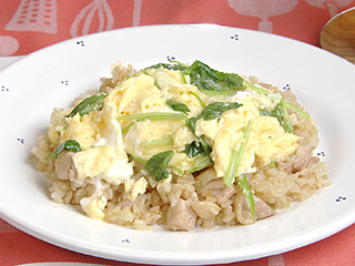 チャーハンはしょうゆ味で、スクランブルエッグは甘く、一緒に食べると親子丼のような味わいになります。
