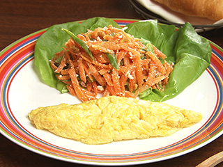 にんじんはたっぷり3本使い、太めのせん切りにし、電子レンジで歯ごたえが残る程度に加熱をして、手早く冷ましておくこと。