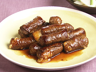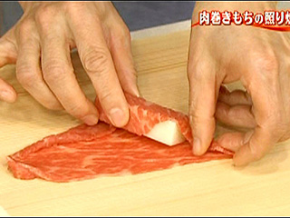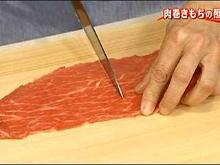 (2)両端もきっちりともちを包み込むように巻く(肉が厚くなると焼き時間がかかる)。