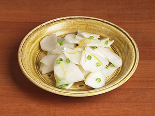 材料: かぶ・・・4個(300g) かぶの葉・・・適量 塩・・・小さじ1 柚子の絞り汁・・・大さじ1 柚子の皮・・・少々 作り方 (1)かぶは薄切り、かぶの葉は3~4cm長さに切り、ポリ袋に入れ塩をまぶして、袋を閉じ10分ほどおく。 (2)(1)の水気を絞り、ボウルに入れ、柚子の絞り汁、柚子の皮を加えて混ぜる。