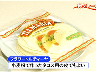 トルティーヤはメキシコ料理のタコスの皮で、本来はとうもろこしが原料だが、小麦粉が原料のものはフラワートルティーヤと呼ばれている。ネット通販、大手スーパー、デパートなどで手に入り、冷凍保存できる。