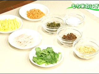 おにぎりの具いろいろ。砂糖、刻んだバターピーナッツ、ハム、牛肉のしぐれ煮、薄焼き卵、鮭フレーク、高菜漬け、刻んだ香菜。