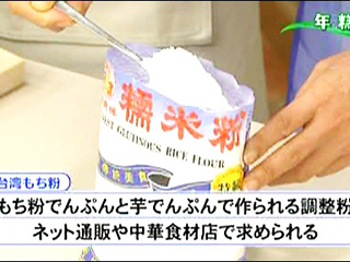 「ニィンカァウ」にはなくてはならない台湾産のもち粉で、もち米でんぷんとじゃが芋でんぷんで作られる調整粉。日本の白玉粉に近い。ネット通販や中国食材店で求められるが、手に入らないときは、白玉粉に上新粉を加えて作るとよい。