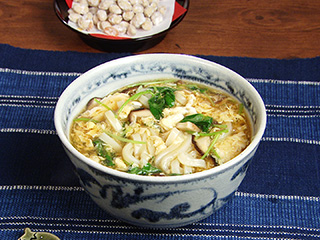 とろみが付いたら、しっかり煮立てて卵を流し入れ、鍋の底から静かに持ち上げる様にまぜると、きれいな卵あんかけになります。