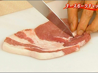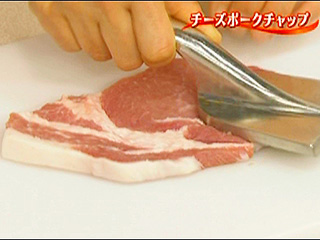 (1)豚肉が焼いたときに反りかえらないように、まず叩いてのばす。